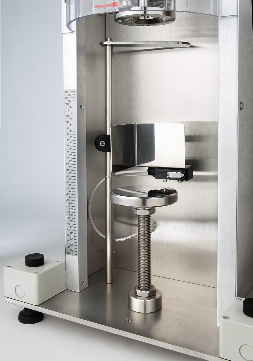 Il piattello su cui poggia la bottiglia è regolabile in altezza e può essere dotato di uno strato di gomma anti-rotazione o di un centratore dedicato per gestire forme di bottiglie particolari o instabili.